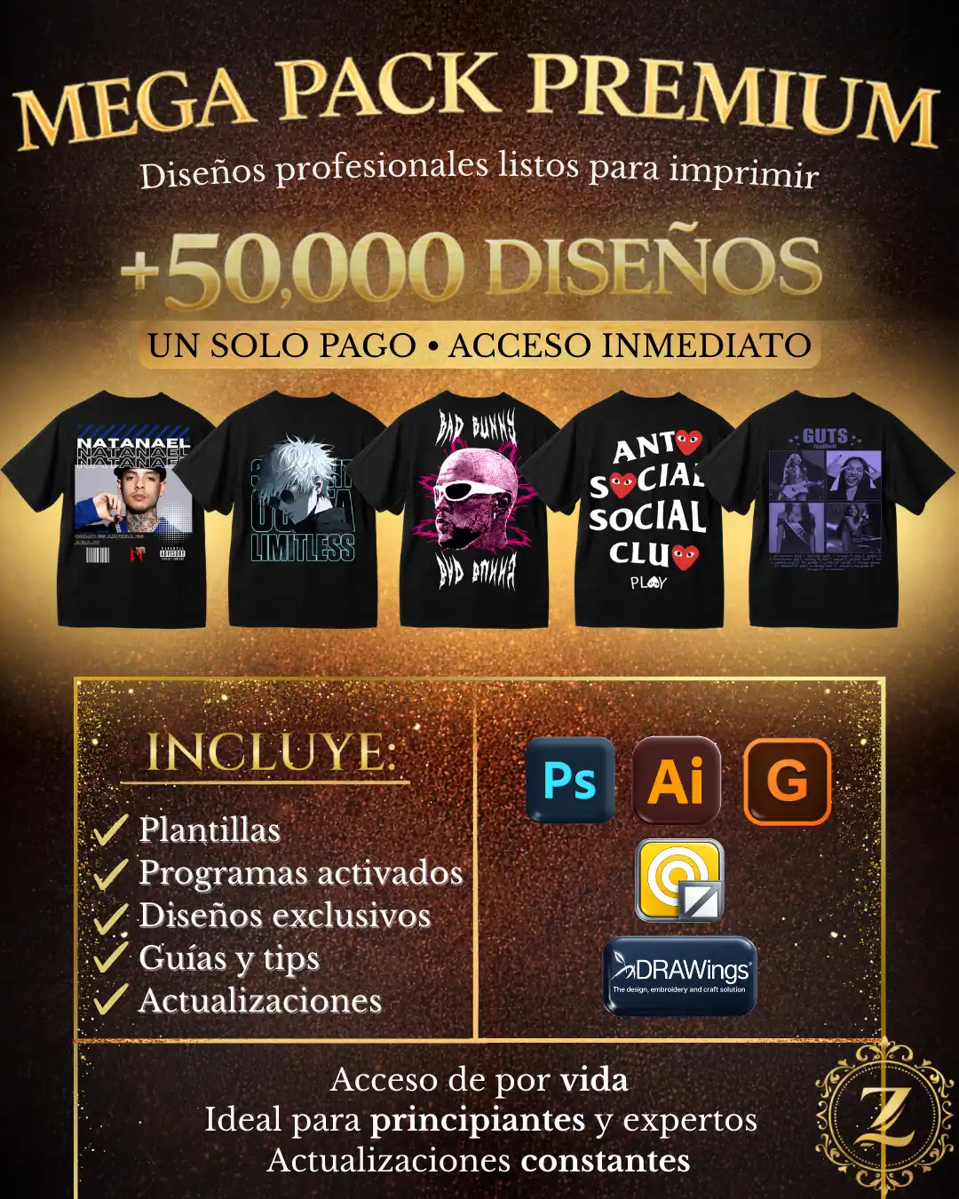 El Mega Pack Premium Zerattiamo es la forma más rápida y completa de iniciar tu emprendimiento. Incluye 50,000+ diseños listos para imprimir, mockups, medidas por talla, reglas de cuello, guías paso a paso y plantillas de costos para que sepas exactamente cuánto cobrar y cómo vender.